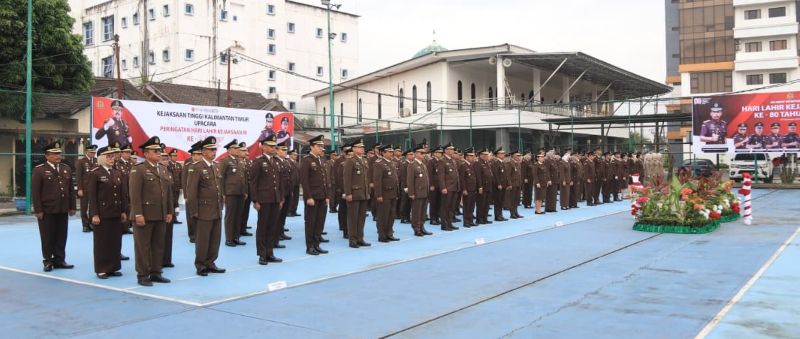 Wakil Kepala Kejaksaan Tinggi Kalimantan Timur Zullikar Tanjung, SH.MH, para Asisten, Kabag TU, para Koordinator dan seluruh pegawai Kejaksaan Tinggi Kalimantan Timur ikuti upacara Hari Lahir Kejaksaan ke-80 di lapangan tennis Kantor Kejati Kaltim.
